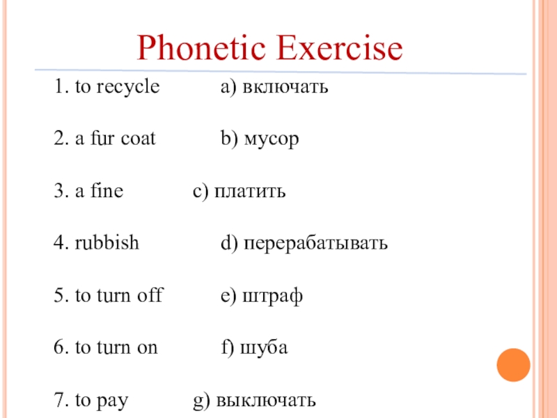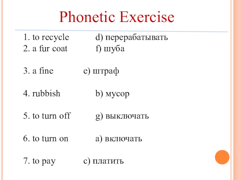 Phonetic Exercise1. to recycle			d) перерабатывать 			2. a fur coat			f) шуба3. a fine			e) штраф4. rubbish			b) мусор5. to turn