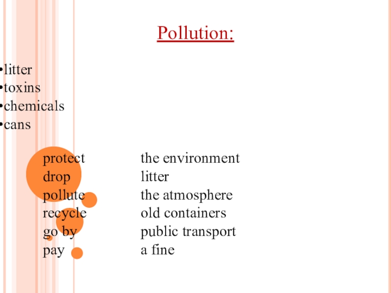 Pollution:littertoxinschemicalscans		protect 			the environment		drop				litter		pollute			the atmosphere		recycle			old containers		go by				public transport		pay				a fine