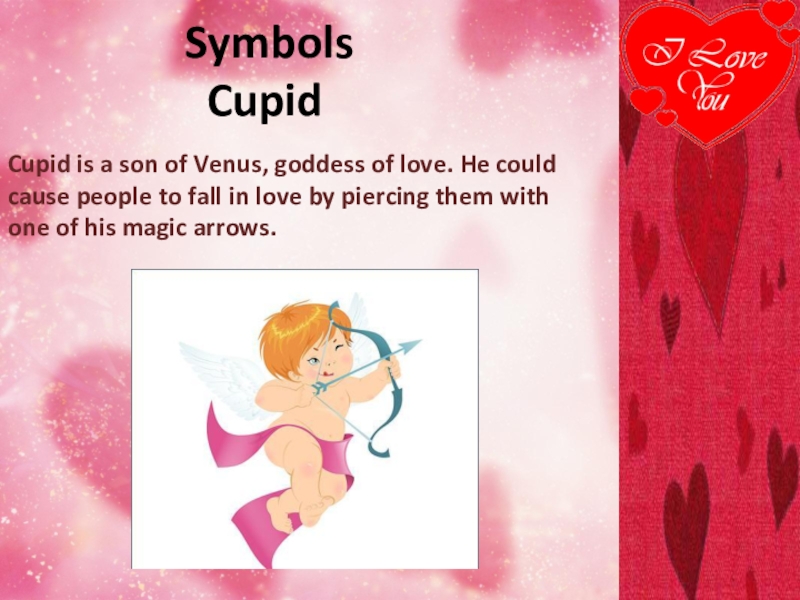 Cupid is a son of Venus, goddess of love. He could cause people to fall in love by piercing them with one of his magic arrows.