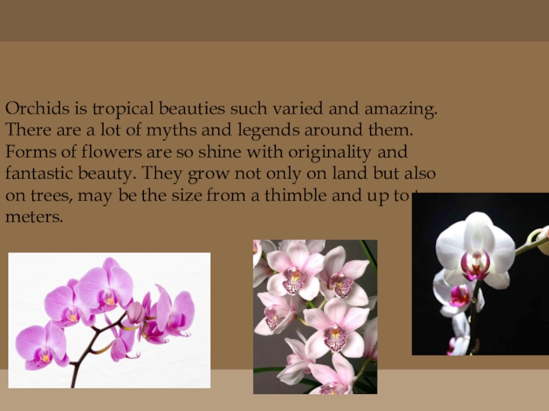 lot of myths and legends around them. Forms of flowers are so shine with originality and fantastic beauty. They grow not only on land but also on trees, may be the size from a thimble and up to ten meters.