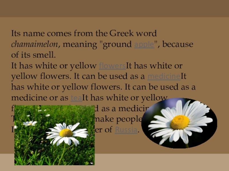 It has white or yellow flowersIt has white or yellow flowers. It can be used as a medicineIt has white or yellow flowers. It can be used as a medicine or as teaIt has white or yellow flowers. It can be used as a medicine or as tea. The camomile helps make people less stressful.