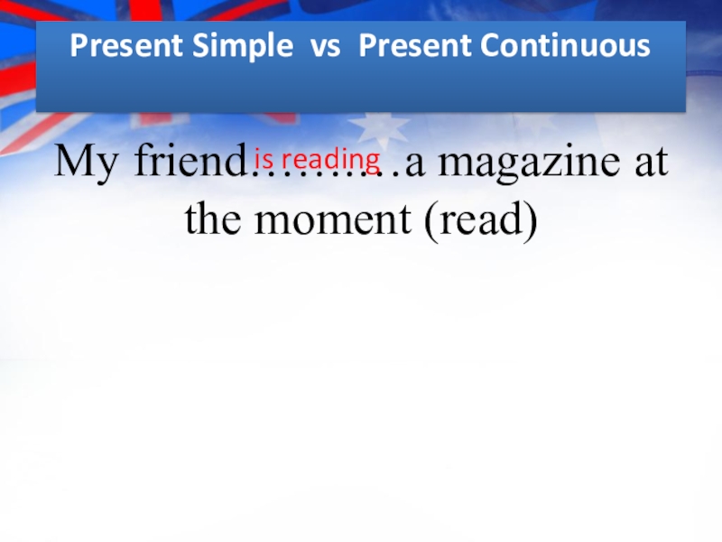 Present Simple vs Present Continuous My friend…….…a magazine at the moment (read)is reading