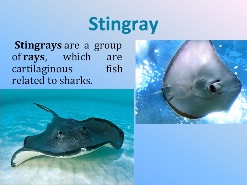 Stingray 	Stingrays are a group of rays, which are cartilaginous fish related to sharks.