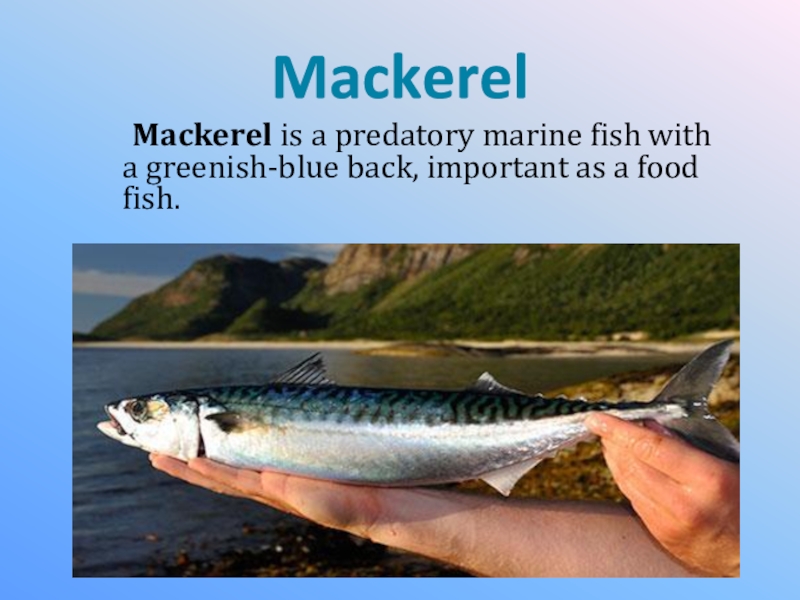 Mackerel	Mackerel is a predatory marine fish with a greenish-blue back, important as a food fish.
