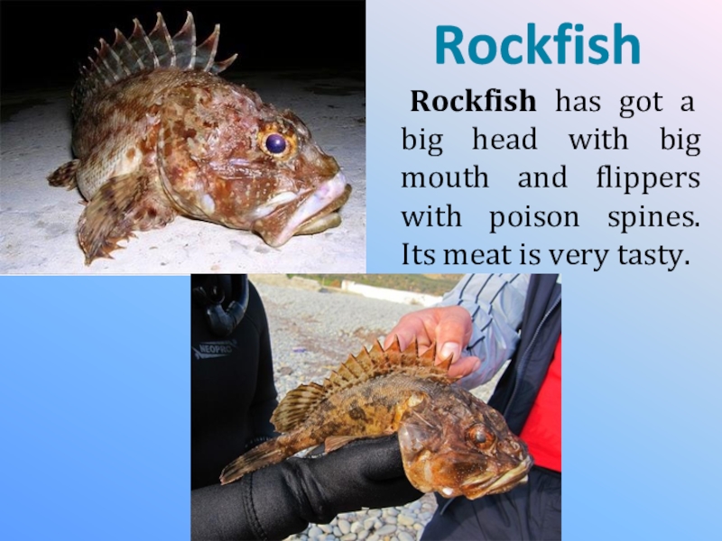 Rockfish 	Rockfish has got a big head with big mouth and flippers with poison spines. Its meat is