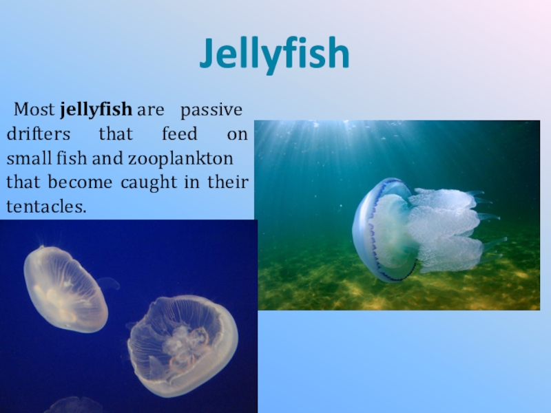 Jellyfish	Most jellyfish are passive drifters that feed on small fish and zooplankton that become caught in their tentacles.