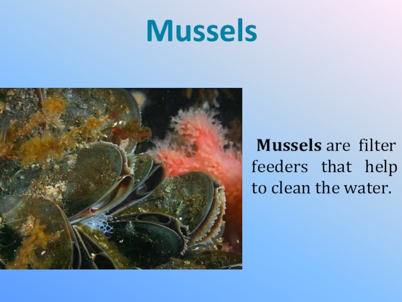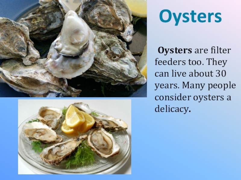 Oysters	Oysters are filter feeders too. They can live about 30 years. Many people consider oysters a delicacy.