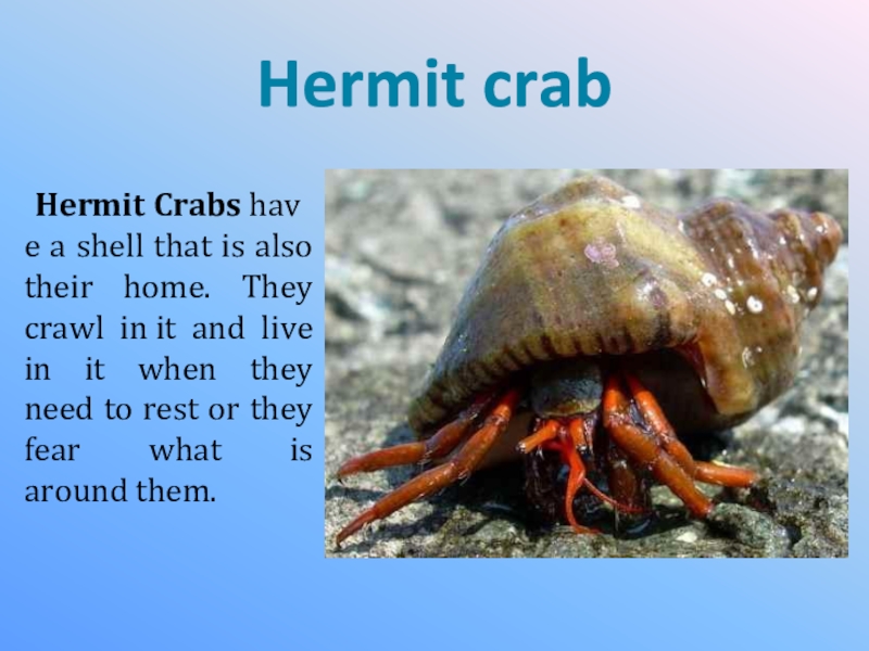 Hermit crab	Hermit Crabs have a shell that is also their home. They crawl in it and live in it when they