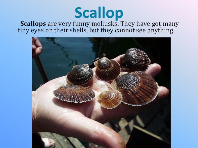 Scallop 	Scallops are very funny mollusks. They have got many tiny eyes on their shells, but they