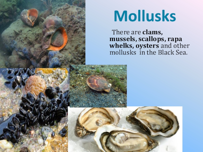 Mollusks	There are clams, mussels, scallops, rapa whelks, oysters and other mollusks in the Black Sea.