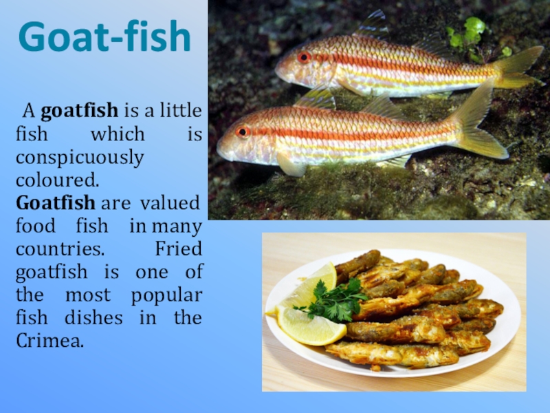 Goat-fish 	A goatfish is a little fish which is conspicuously coloured. Goatfish are valued food fish in many countries. Fried goatfish