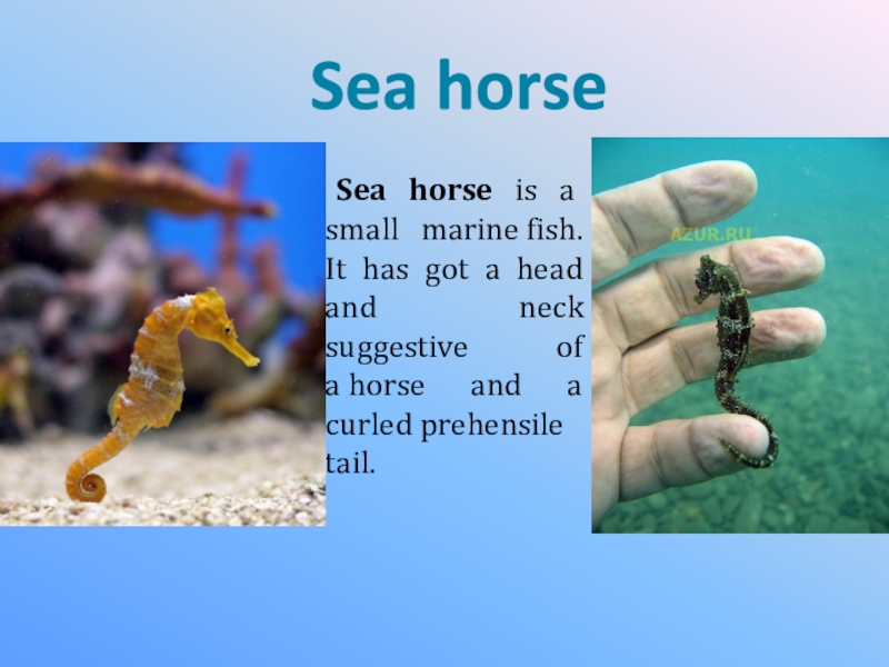 Sea horse	Sea horse is a small marine fish. It has got a head and neck suggestive of a horse
