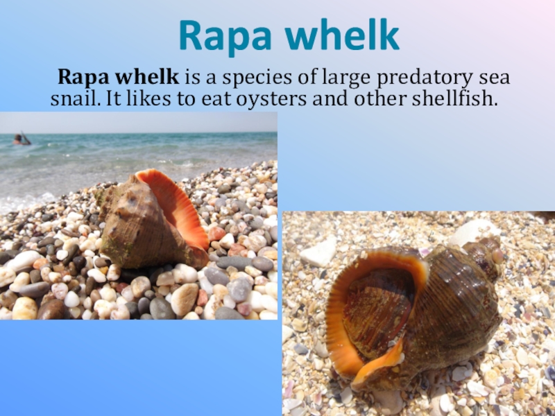 Rapa whelk	Rapa whelk is a species of large predatory sea snail. It likes to eat oysters