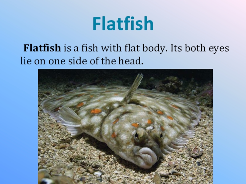 Flatfish	Flatfish is a fish with flat body. Its both eyes lie on one side of the head.