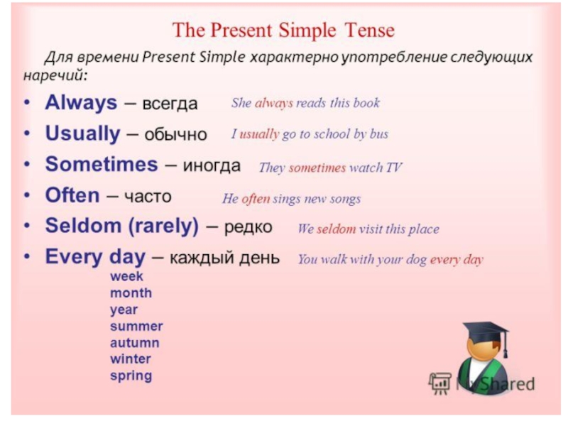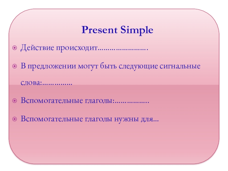 Present SimpleДействие происходит…………………….В предложении могут быть следующие сигнальные слова:……………Вспомогательные глаголы:……………..Вспомогательные глаголы нужны для…