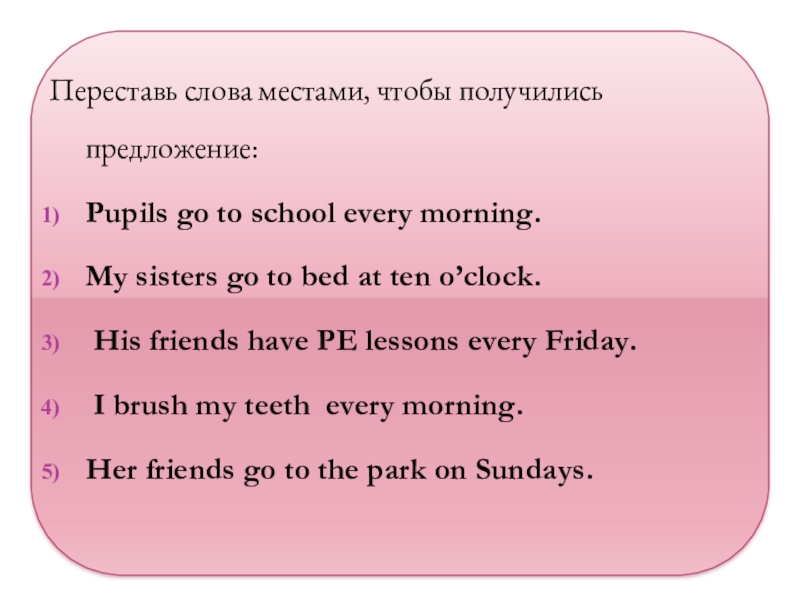 Переставь слова местами, чтобы получились предложение:Go / to school/ every/ pupils/ morning.Sisters/ go/ at/ my/o’clock/ to bed/