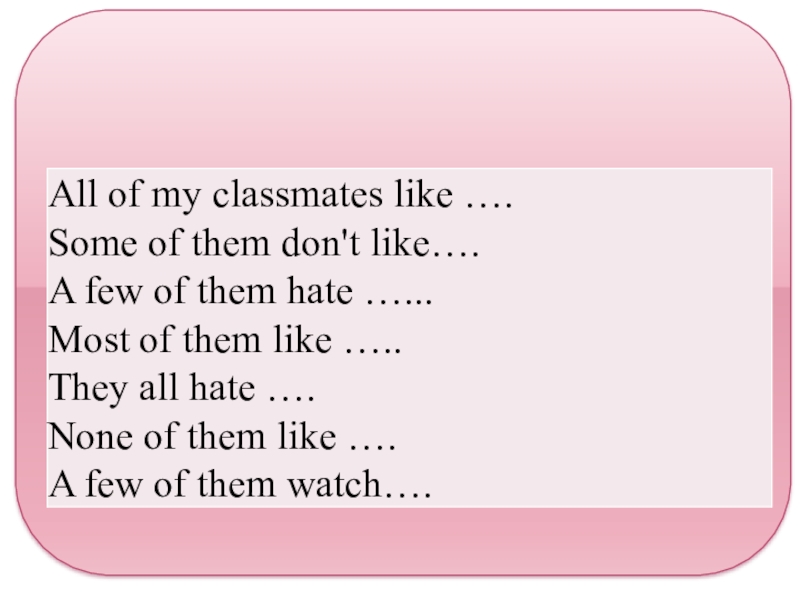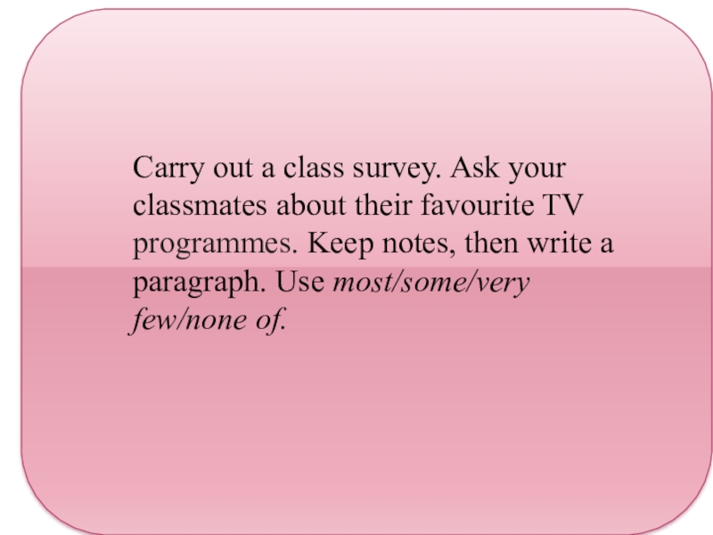 Carry out a class survey. Ask yourclassmates about their favourite TVprogrammes. Keep notes, then write aparagraph. Use