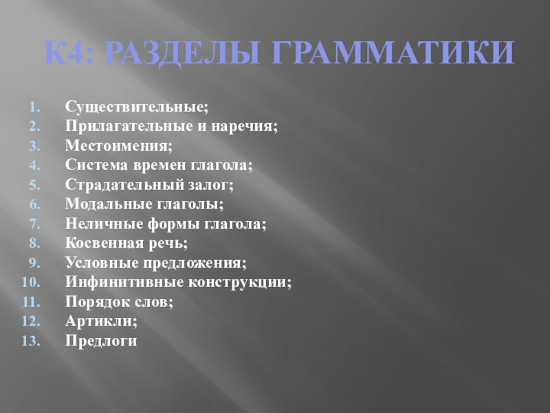 Слайд 38К4: РАЗДЕЛЫ ГРАММАТИКИ