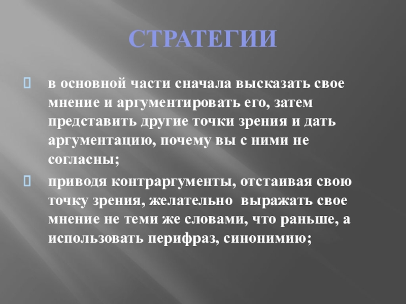 приводя контраргументы, отстаивая свою точку зрения, желательно выражать свое мнение не теми же словами, что раньше, а использовать перифраз, синонимию;