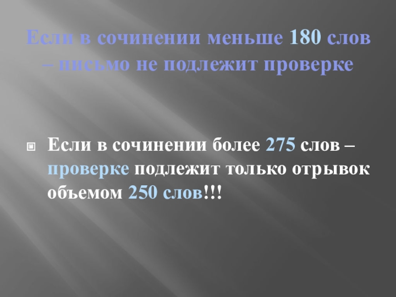 Слайд 4Если в сочинении меньше 180 слов – письмо не подлежит проверке