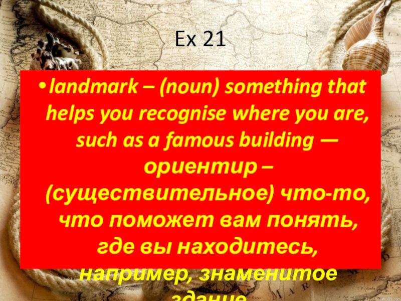 Ex 21landmark – (noun) something that helps you recognise where you are, such as a famous building — ориентир – (существительное) что-то, что поможет вам понять, где вы находитесь, например, знаменитое здание