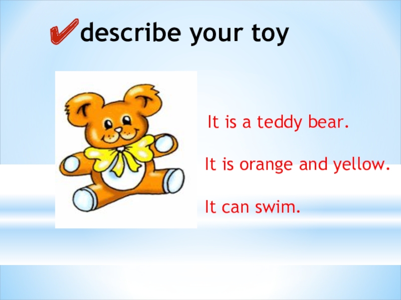 describe your toy It is a teddy bear.It is orange and yellow.It can swim.
