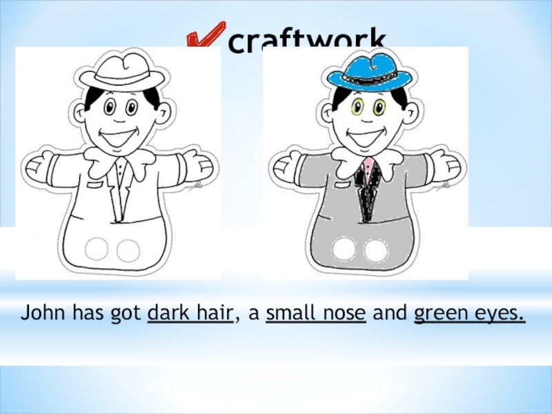 craftworkJohn has got dark hair, a small nose and green eyes.