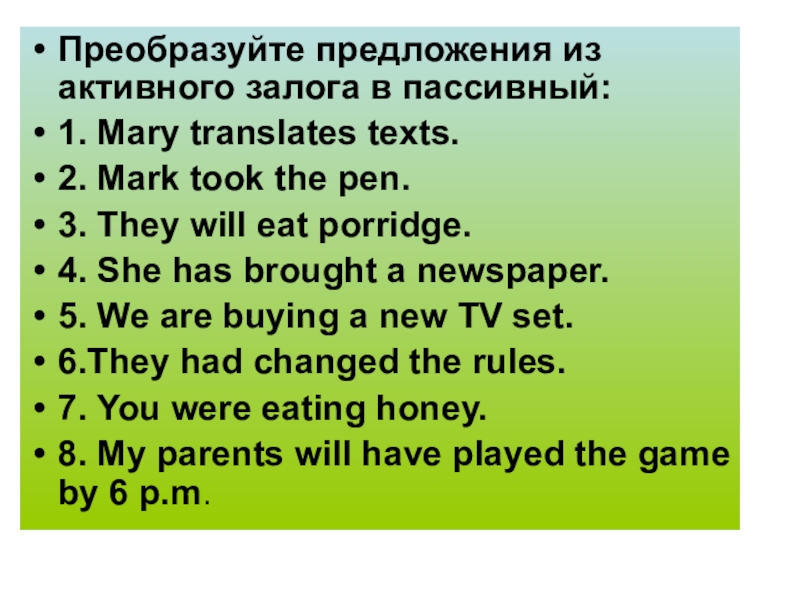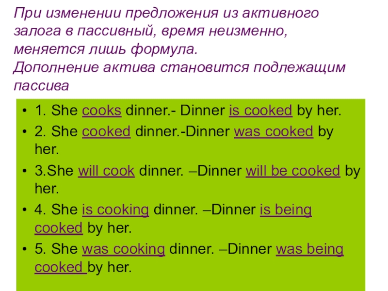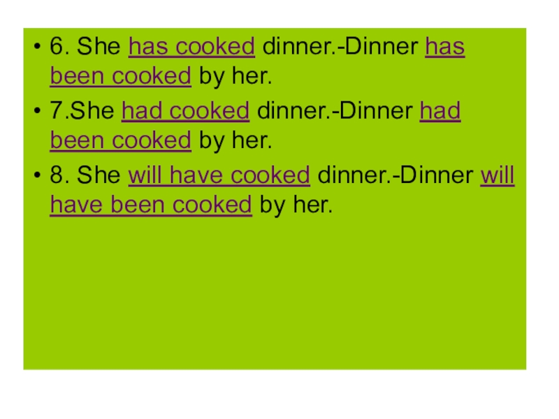 5. She was cooking dinner. –Dinner was being cooked by her.