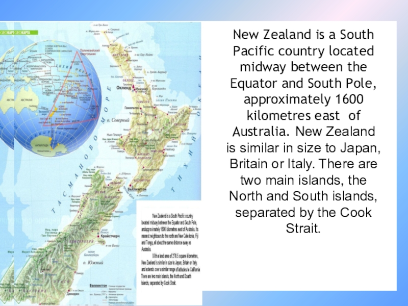 Слайд 3New Zealand is a South Pacific country located midway between the