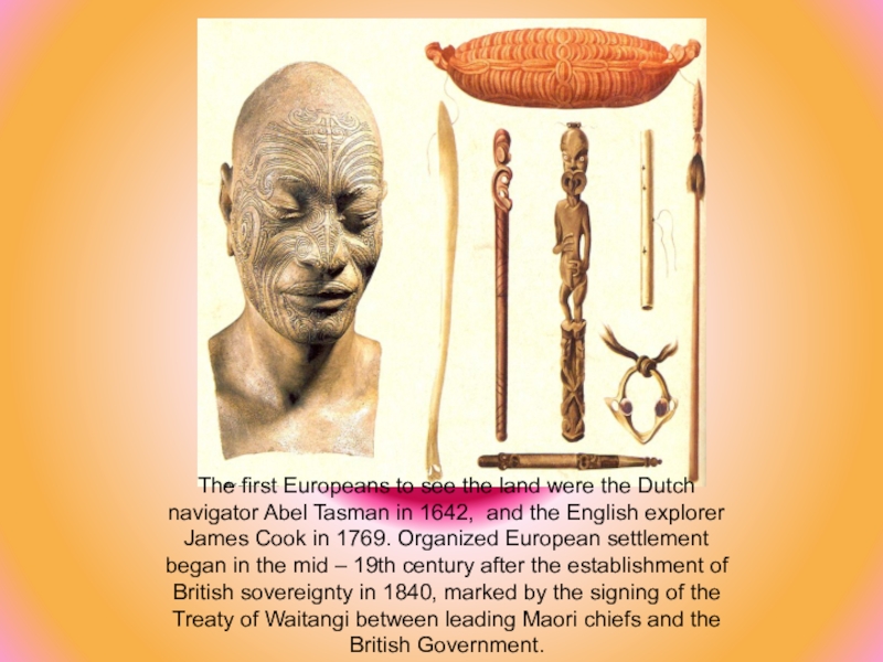 Abel Tasman in 1642, and the English explorer James Cook in 1769. Organized European settlement began in the mid – 19th century after the establishment of British sovereignty in 1840, marked by the signing of the Treaty of Waitangi between leading Maori chiefs and the British Government.