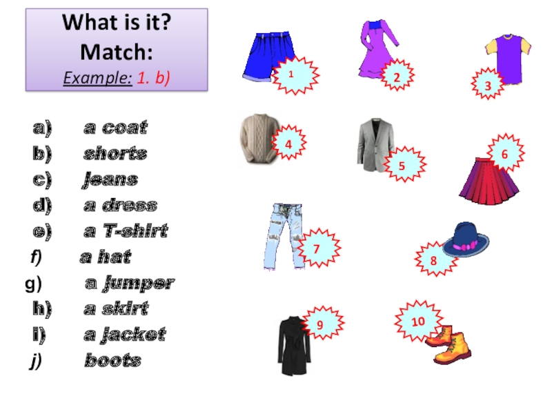 What is it? Match: Example: 1. b)a)   a coat b)   shorts c)