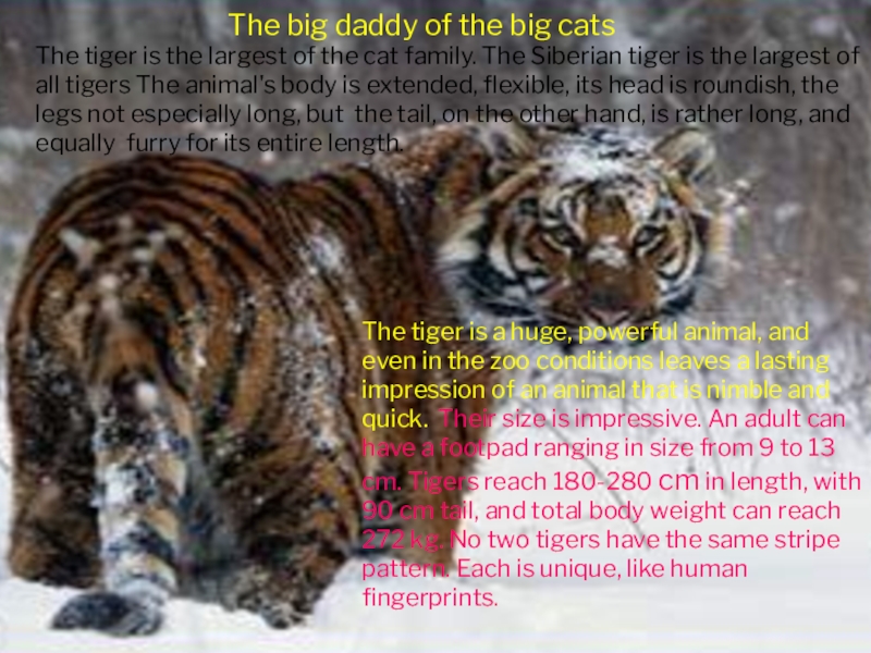 The tiger is a huge, powerful animal, and even in the zoo conditions leaves a lasting impression of an animal that is nimble and quick. Their size is impressive. An adult can have a footpad ranging in size from 9 to 13 cm. Tigers reach 180-280 cm in length, with 90 cm tail, and total body weight can reach 272 kg. No two tigers have the same stripe pattern. Each is unique, like human fingerprints.