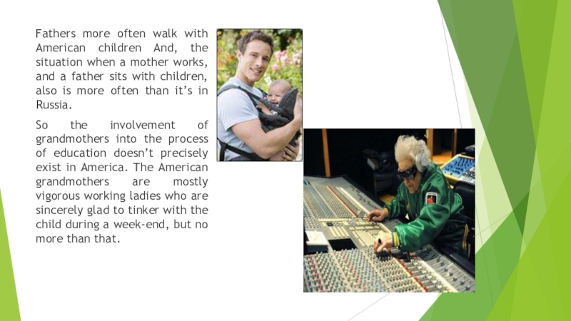 So the involvement of grandmothers into the process of education doesn’t precisely exist in America. The American grandmothers are mostly vigorous working ladies who are sincerely glad to tinker with the child during a week-end, but no more than that.