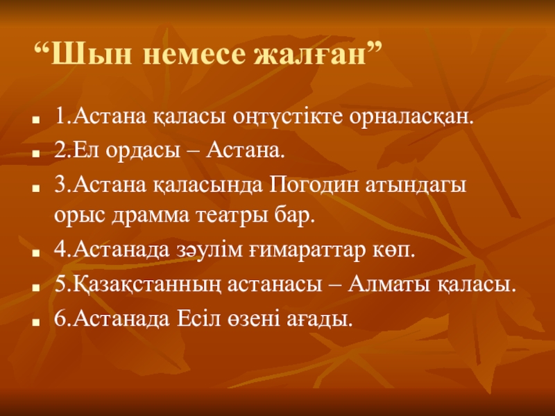“Шын немесе жалған”1.Астана қаласы оңтүстікте орналасқан.2.Ел ордасы – Астана.3.Астана қаласында Погодин атындагы орыс драмма театры бар.4.Астанада зәулім