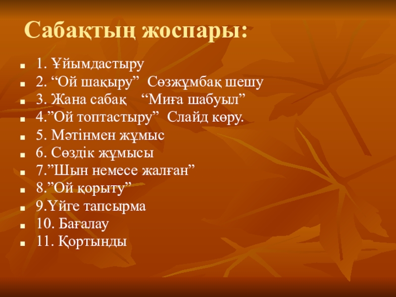 Сабақтың жоспары:1. Ұйымдастыру2. “Ой шақыру” Сөзжұмбақ шешу3. Жана сабақ  “Миға шабуыл”4.”Ой топтастыру” Слайд көру.5. Мәтінмен жұмыс6.