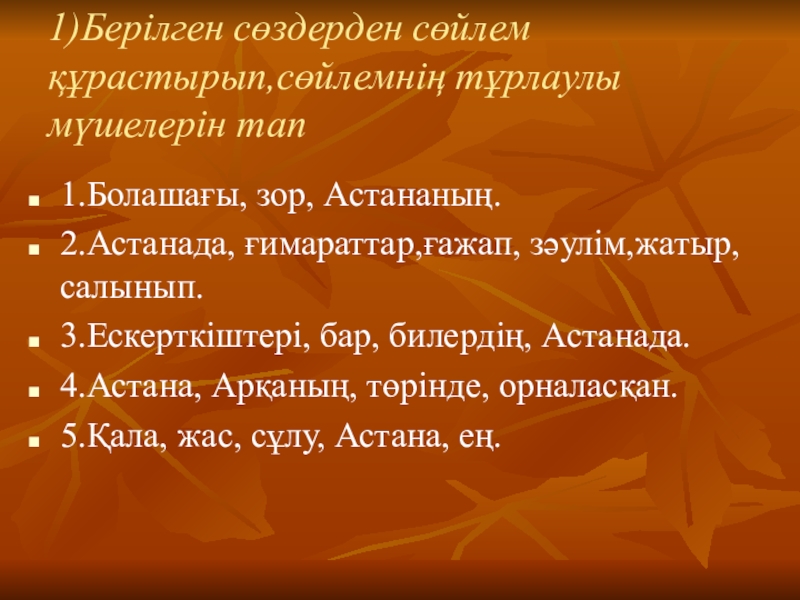Слайд 71)Берілген сөздерден сөйлем құрастырып,сөйлемнің тұрлаулы мүшелерін тап