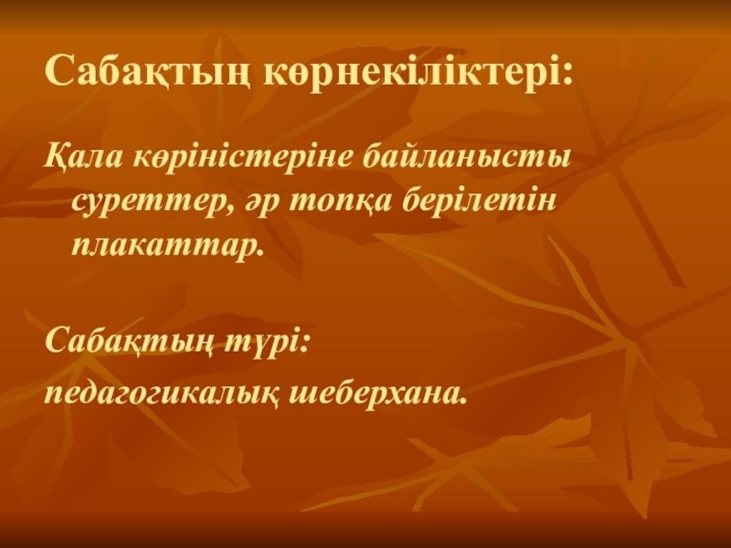 Сабақтың көрнекіліктері:Қала көріністеріне байланысты суреттер, әр топқа берілетін плакаттар.Сабақтың түрі:       педагогикалық