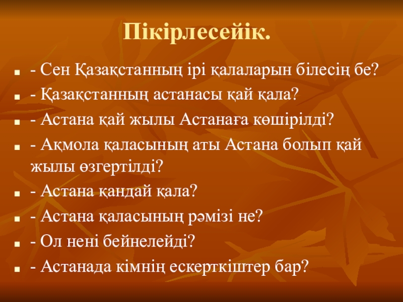 Пікірлесейік.- Сен Қазақстанның ірі қалаларын білесің бе?- Қазақстанның астанасы қай қала?- Астана қай жылы Астанаға көшірілді?- Ақмола