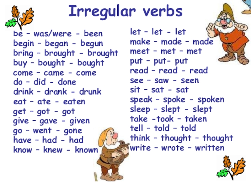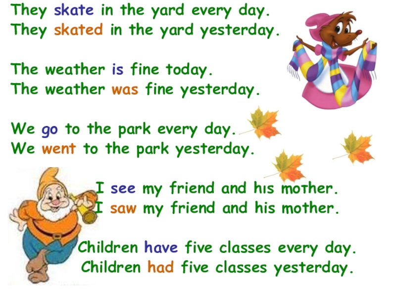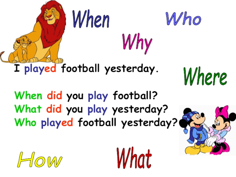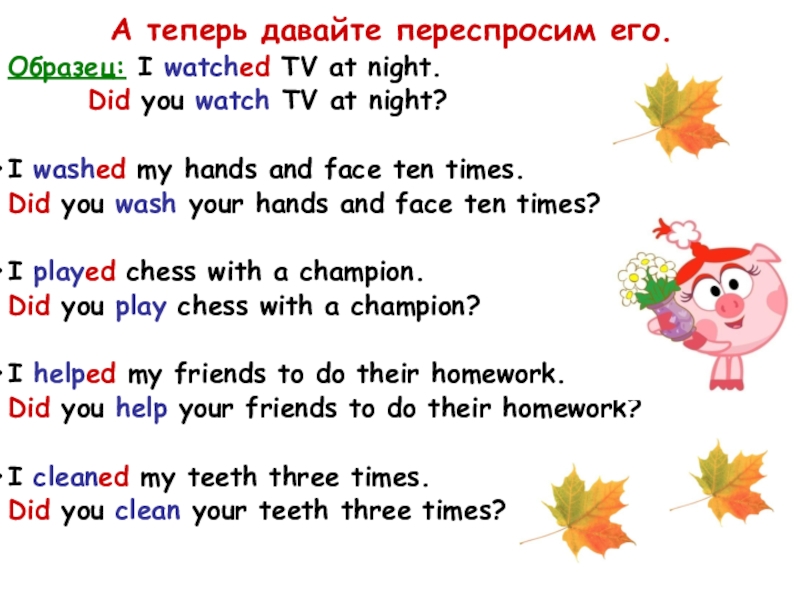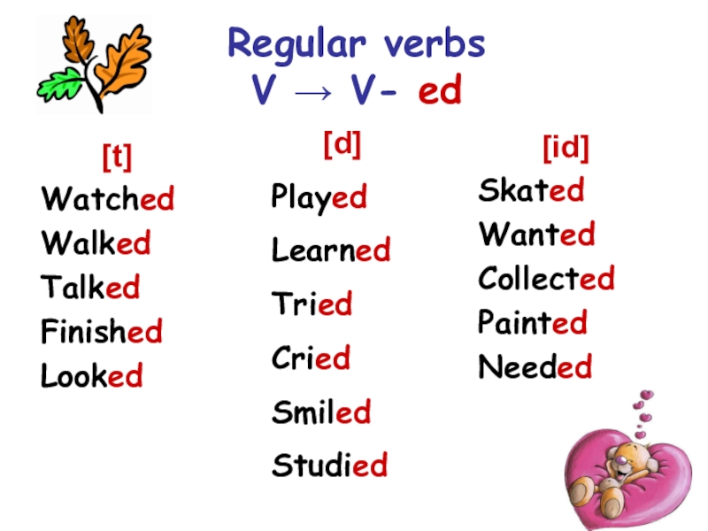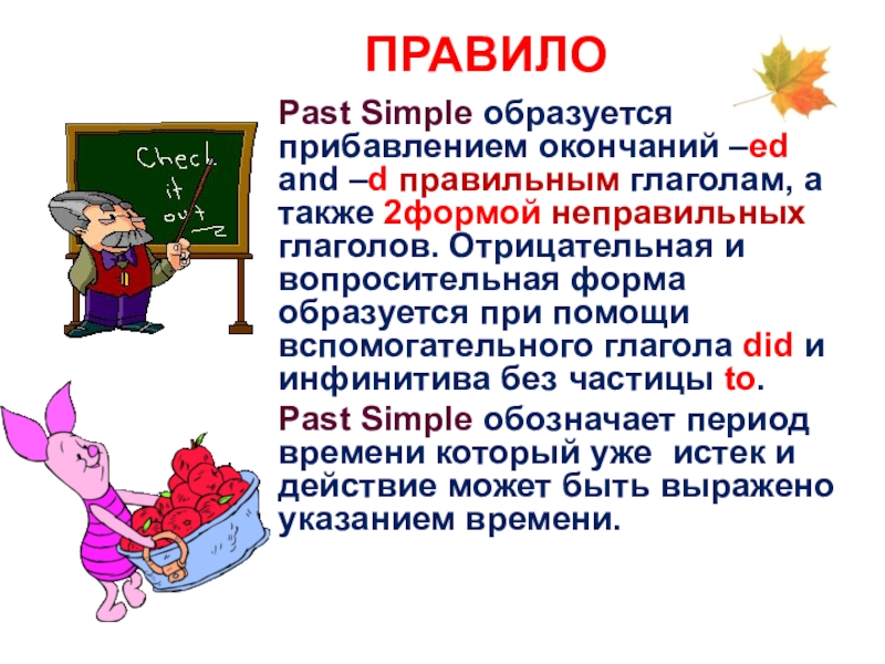 Past Simple образуется прибавлением окончаний –ed and –d правильным глаголам, а также 2формой неправильных глаголов. Отрицательная и вопросительная форма образуется при помощи вспомогательного глагола did и инфинитива без частицы to.