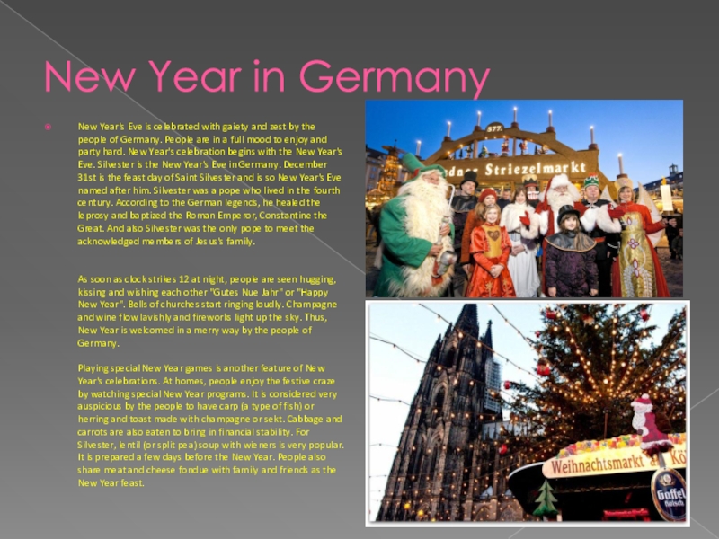 zest by the people of Germany. People are in a full mood to enjoy and party hard. New Year's celebration begins with the New Year's Eve. Silvester is the New Year's Eve in Germany. December 31st is the feast day of Saint Silvester and is so New Year's Eve named after him. Silvester was a pope who lived in the fourth century. According to the German legends, he healed the leprosy and baptized the Roman Emperor, Constantine the Great. And also Silvester was the only pope to meet the acknowledged members of Jesus's family.