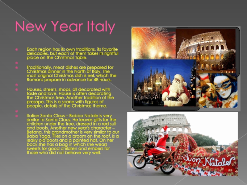 Italian Santa Claus – Babbo Natale is very similar to Santa Claus. He leaves gifts for the children under the tree, dressed in a red suit and boots. Another new year's character – Befana, this grandmother is very similar to our Baba Yaga. Flies on a broom on the roof, is a leaky old boots and a pointed hat. On her back she has a bag in which she wears sweets for good children and embers for those who did not behave very well.