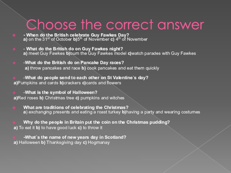 a) Halloween b) Thanksgiving day c) Hogmanay
