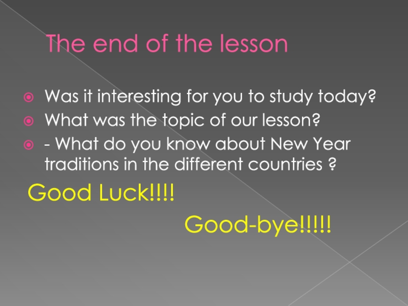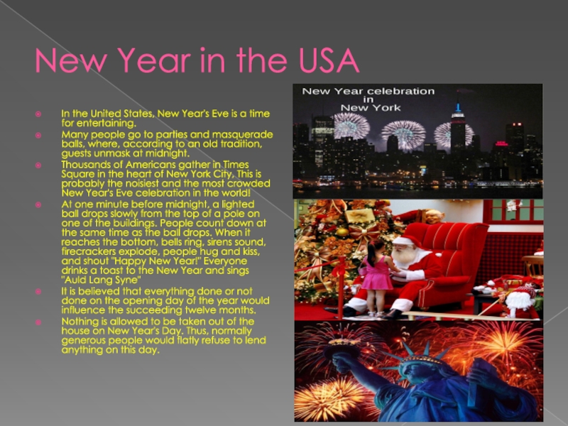 At twelve o’clock in the night people can see the president on TV which addresses them with traditional words of congratulation. At this time people are sitting at the tables to their holiday dinner and enjoy it in a good company. Young people usually organize a dance party and have a lot of fun. Some of them go out into the streets and the squares. The next day friends usually come to wish a Happy New Year to all the members of the family.