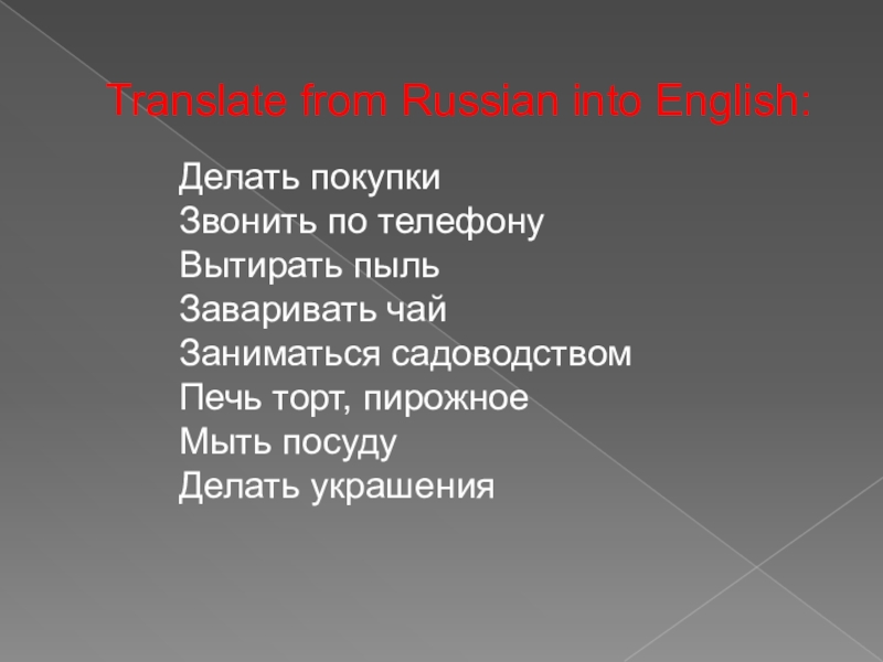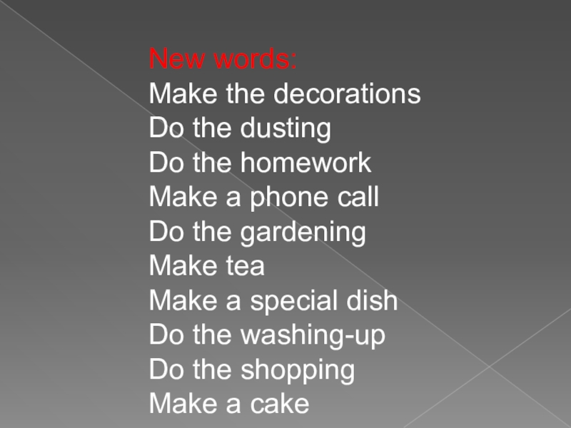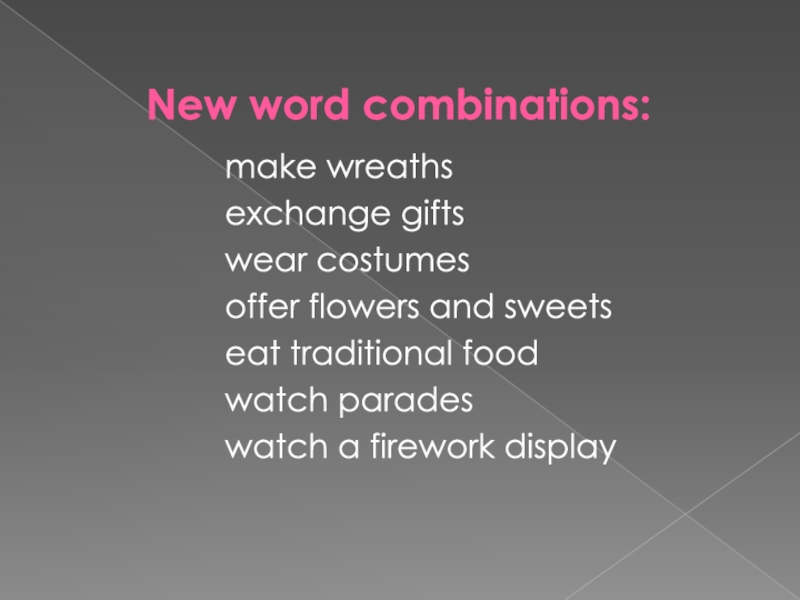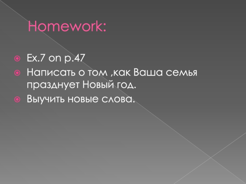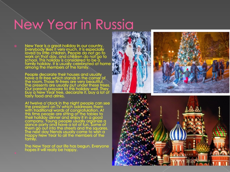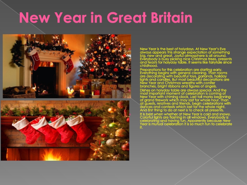 People decorate their houses and usually have a fir-tree which stands in the corner of the room. Those fir-trees are very beautiful. The presents are usually put under these trees. Our parents prepare to this holiday well. They buy a New Year tree, decorate it, buy a lot of tasty food and drinks.