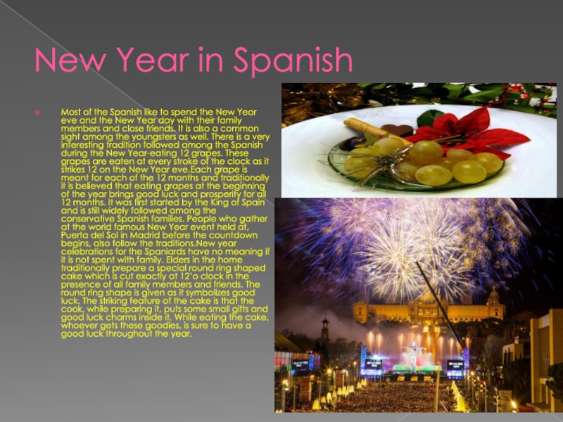 New Year eve and the New Year day with their family members and close friends. It is also a common sight among the youngsters as well. There is a very interesting tradition followed among the Spanish during the New Year-eating 12 grapes. These grapes are eaten at every stroke of the clock as it strikes 12 on the New Year eve.Each grape is meant for each of the 12 months and traditionally it is believed that eating grapes at the beginning of the year brings good luck and prosperity for all 12 months. It was first started by the King of Spain and is still widely followed among the conservative Spanish families. People who gather at the world famous New Year event held at, Puerta del Sol in Madrid before the countdown begins, also follow the traditions.New year celebrations for the Spaniards have no meaning if it is not spent with family. Elders in the home traditionally prepare a special round ring shaped cake which is cut exactly at 12’o clock in the presence of all family members and friends. The round ring shape is given as it symbolizes good luck. The striking feature of the cake is that the cook, while preparing it, puts some small gifts and good luck charms inside it. While eating the cake, whoever gets these goodies, is sure to have a good luck throughout the year.