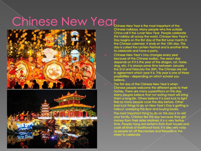 The most important thing to do on this day is to visit your family. Children like this day because they get money from their older relatives. It is a very festive time. People hang red lanterns from their houses and cook all kinds of traditional food. It is also very noisy as people let off firecrackers and fireworks in the street to celebrate