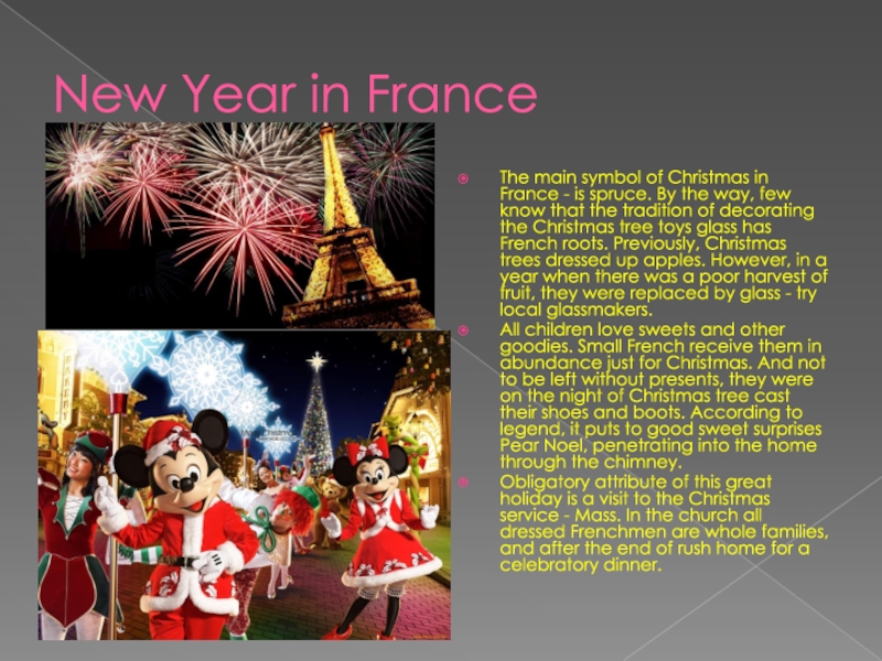 is spruce. By the way, few know that the tradition of decorating the Christmas tree toys glass has French roots. Previously, Christmas trees dressed up apples. However, in a year when there was a poor harvest of fruit, they were replaced by glass - try local glassmakers.