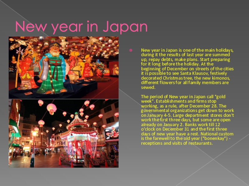 The period of New year in Japan call "gold week". Establishments and firms stop working, as a rule, after December 28. The governmental organizations get down to work on January 4-5. Large department stores don't work the first three days, but some are open already on January 2. Banks work till 12 o'clock on December 31 and the first three days of new year have a rest. National custom is the farewell to the old year ("bonenkay") - receptions and visits of restaurants.