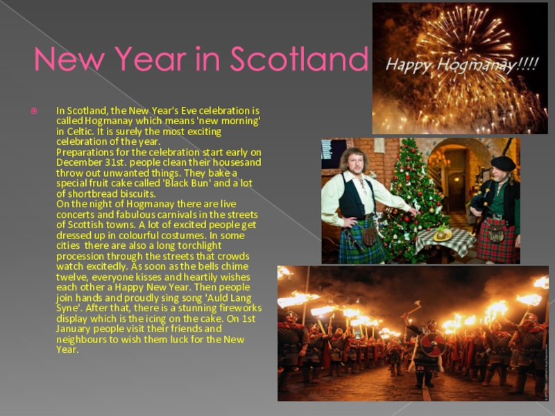 On the night of Hogmanay there are live concerts and fabulous carnivals in the streets of Scottish towns. A lot of excited people get dressed up in colourful costumes. In some cities there are also a long torchlight procession through the streets that crowds watch excitedly. As soon as the bells chime twelve, everyone kisses and heartily wishes each other a Happy New Year. Then people join hands and proudly sing song 'Auld Lang Syne'. After that, there is a stunning fireworks display which is the icing on the cake. On 1st January people visit their friends and neighbours to wish them luck for the New Year.