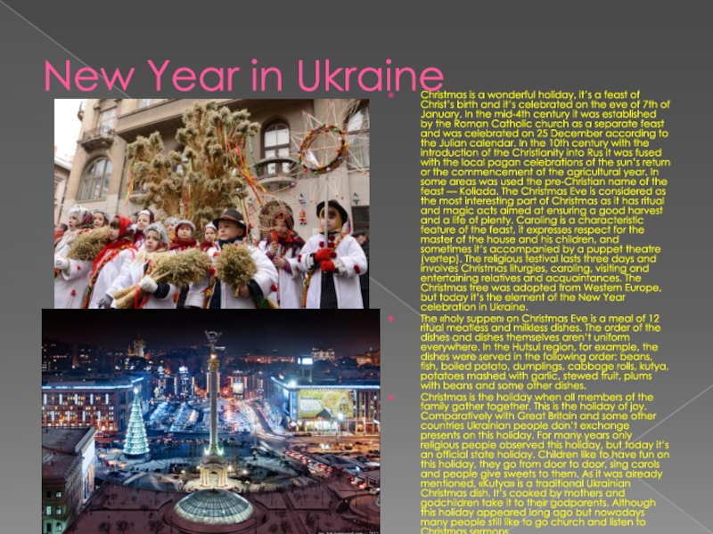 Christmas is the holiday when all members of the family gather together. This is the holiday of joy. Comparatively with Great Britain and some other countries Ukrainian people don’t exchange presents on this holiday. For many years only religious people observed this holiday, but today it’s an official state holiday. Children like to have fun on this holiday, they go from door to door, sing carols and people give sweets to them. As it was already mentioned, «Kutya» is a traditional Ukrainian Christmas dish. It’s cooked by mothers and godchildren take it to their godparents. Although this holiday appeared long ago but nowadays many people still like to go church and listen to Christmas sermons.